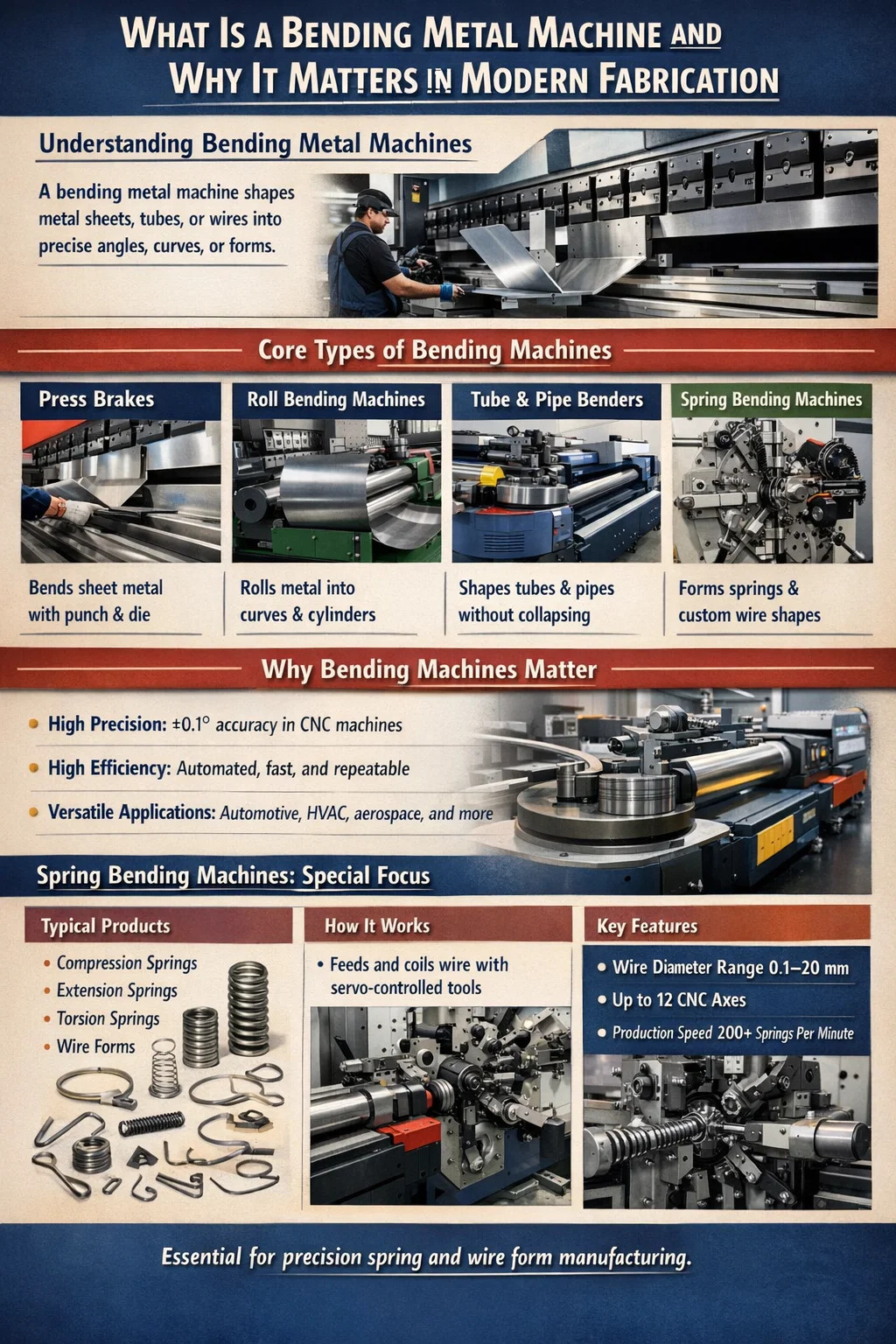Fjäderbockningsmaskinen är en specialiserad undergrupp av den bredare bockmaskinfamiljen. Medan en allmän kantpress fokuserar på plåt, en fjäderbockningsmaskin är konstruerad speciellt för att linda, linda och forma tråd- eller stavmaterial till tryckfjädrar, förlängningsfjädrar, torsionsfjädrar och specialanpassade trådformer. Dessa två maskintyper samexisterar ofta i samma anläggning – och att förstå hur de kompletterar varandra är viktigt för alla tillverkningsansvariga som skaffar utrustning.
