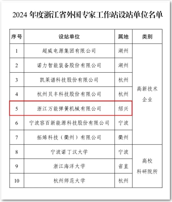 2024, Zhejiang Universal Spring Machinery Co., Ltd är hedrad att vara det enda företaget som valts ut i Shaoxing City, återigen för Shaoxing City att vinna äran. Denna prestation bekräftar inte bara företagets tekniska innovation och internationella utvecklingsstrategi, utan markerar också ett nytt steg i global konkurrenskraft.