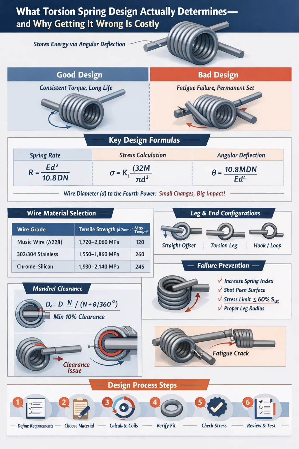 This article walks through the full design process: from fundamental equations and material selection to manufacturing constraints imposed by torsion spring machines, common failure modes, and practical tolerancing strategies used in high-volume production.