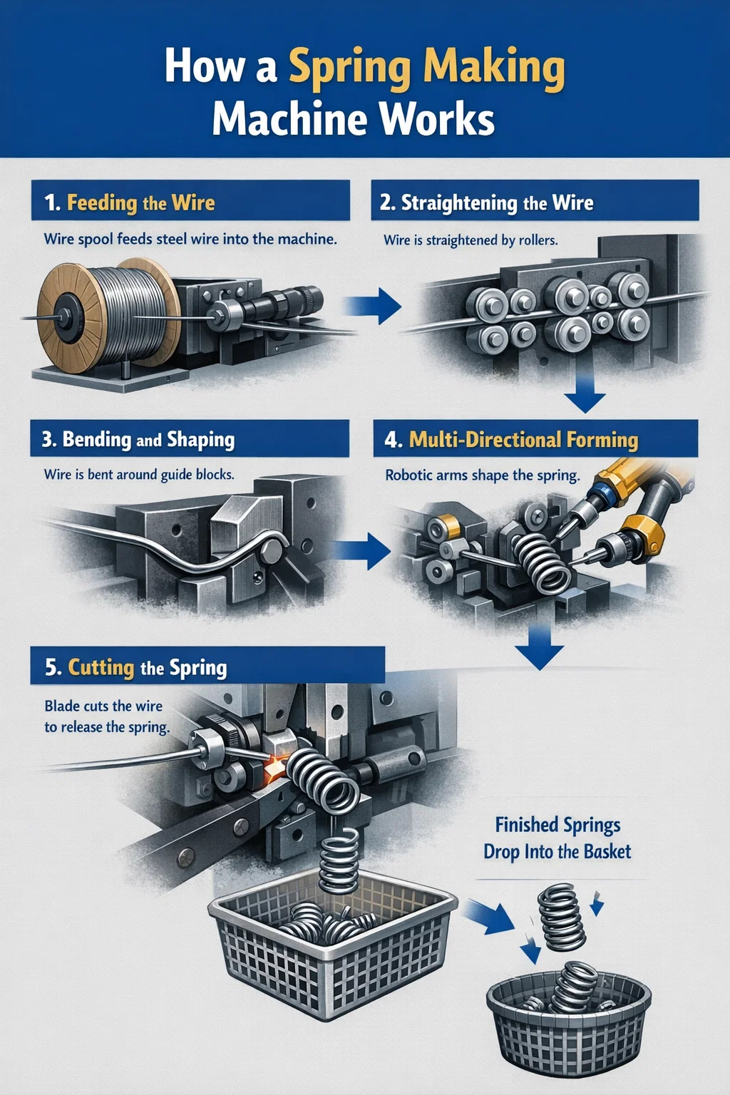På baksidan av maskinen finns ett stort ställ som rymmer hundratals eller tusentals meter ståltråd. Inuti maskinen griper en uppsättning roterande rullar tråden hårt och matar den kontinuerligt in i maskinens kärna. Mängden och hastigheten på den matade tråden bestämmer direkt fjäderlängden.