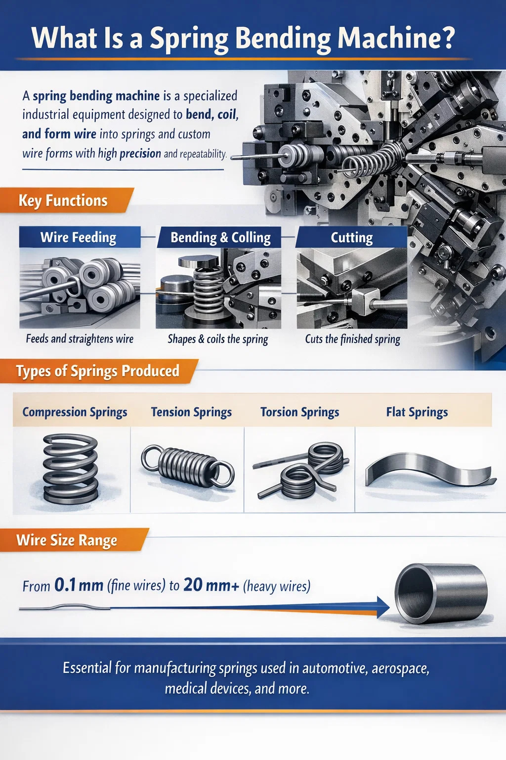 Den globala fjädertillverkningsindustrin är betydande. Fjädrar används i praktiskt taget alla mekaniska produkter – från kulspetspennor och medicinsk utrustning till fordonsupphängningar och flygmotorer. Vårmarknaden värderades till över 24 miljarder USD 2023 , och fjäderbockningsmaskiner är de primära produktionsverktygen bakom denna produktion. Att förstå vad dessa maskiner är och hur de fungerar är viktigt för alla som är involverade i fjädertillverkning, inköp eller ingenjörsdesign.