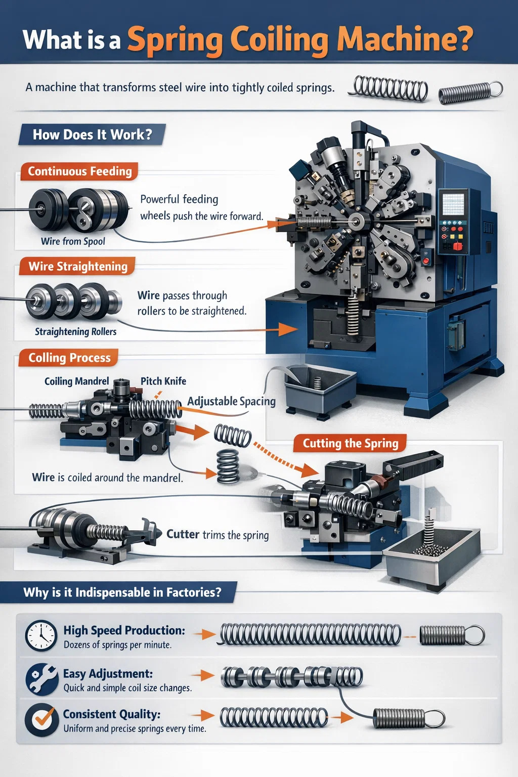 Enkelt uttryckt är en fjäderlindningsmaskin en maskin speciellt utformad för att "spola" metalltråd till en spiralform.
