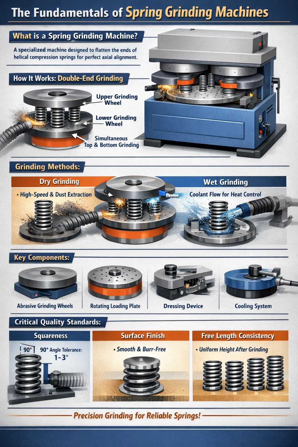 Den grundläggande arbetsprincipen för en fjäder slipmaskin involverar den relativa rörelsen mellan fjädern och två höghastighetsroterande abrasiva hjul. De flesta moderna maskiner använder en dubbeländsslipning tillvägagångssätt, vilket innebär att både toppen och botten av fjädern bearbetas samtidigt.