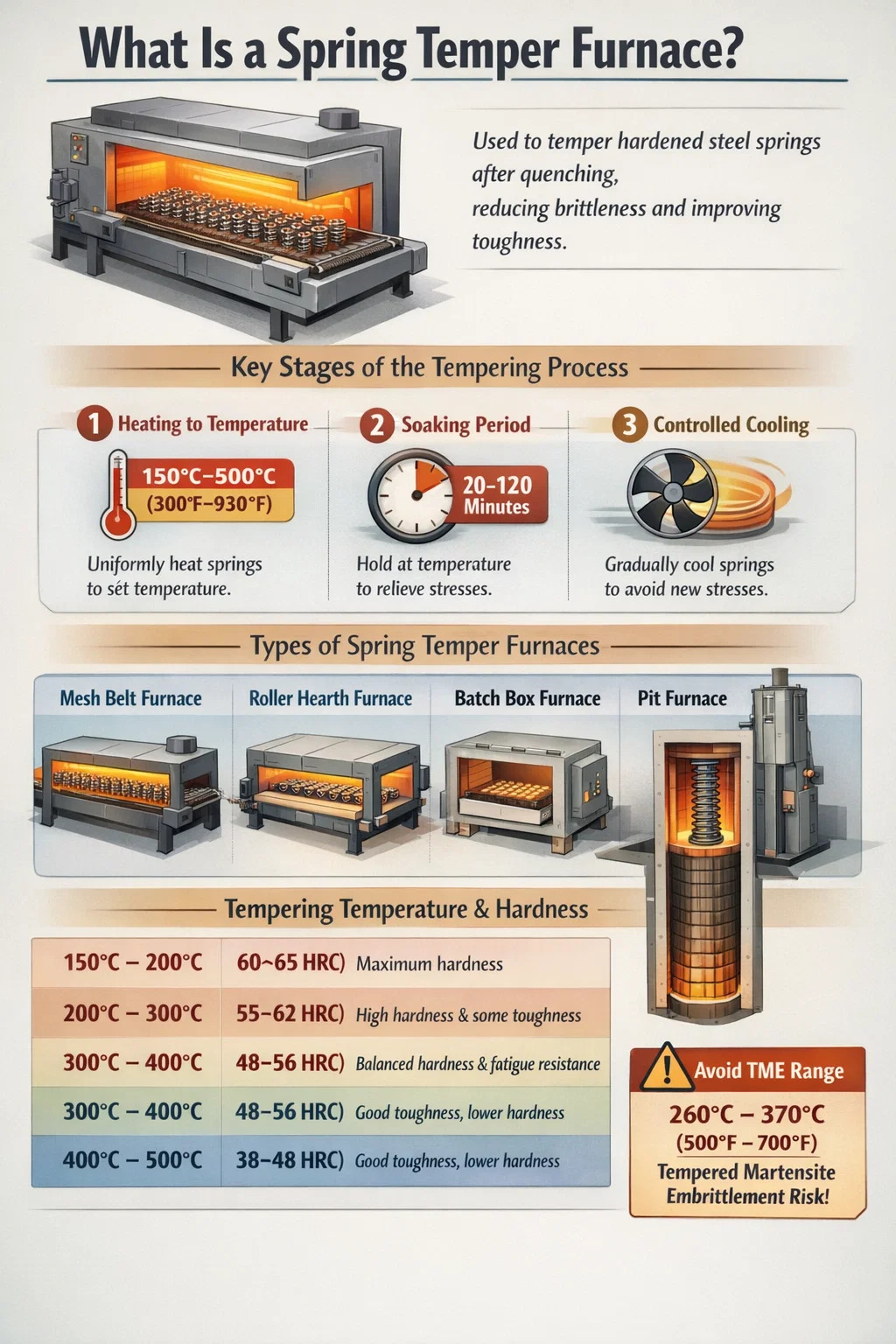 En kritisk zon att undvika är intervall för tempererad martensitförsprödning (TME). , vanligtvis mellan 260°C och 370°C (500°F till 700°F) . Anlöpning inom detta område kan faktiskt minska segheten snarare än att förbättra den, ett fenomen som orsakas av utfällning av karbider vid tidigare austenitkorngränser. Ansvarsfulla ugnsoperatörer designar sina tempereringscykler så att de antingen stannar under eller överskrider detta intervall snarare än att stanna kvar i det. Detta är en anledning till att fordonsventilfjäderspecifikationer ofta anger anlöpning vid eller över 380°C till 420°C.